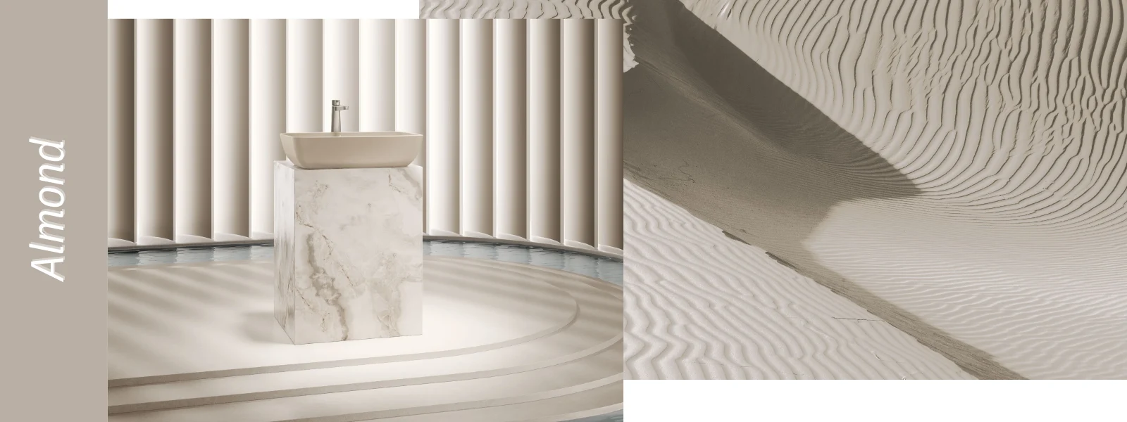 A matt, meleg bézs árnyalat finoman púderes hatást kelt, és harmóniát, valamint nyugalmat sugároz. Kellemesen visszafogott, könnyedén illeszkedik a különböző enteriőr-koncepciókhoz, miközben megőrzi saját, elegáns karakterét. Az Almond természetes melegséggel tölti meg a fürdőszobát, és a jóllét érzetét kelti – tökéletes választás egy természetes hangulatú fürdőszobához.