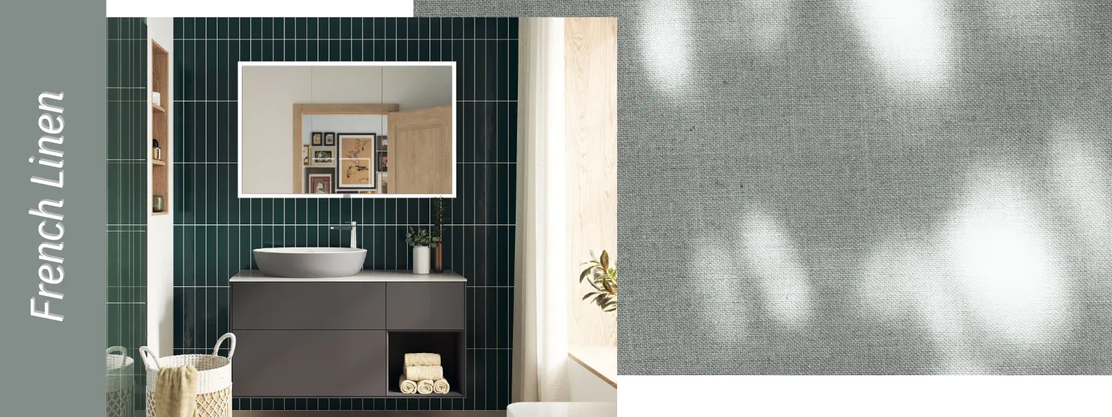 A French Linen a francia könnyedség különleges megjelenését ünnepli. A puritán, világosszürke árnyalat diszkrét eleganciájával finom, kifinomult karaktert kölcsönöz a fürdőszobának. A French Linen a világos és sötét tónusok közötti közvetítő szerepet is betölti, és egy fehér fürdőszobában a fény és árnyék finom játékát a lehető legszebben emeli ki. Ez a szín nyugodt atmoszférával és letisztult eleganciával ruházza fel a teret.