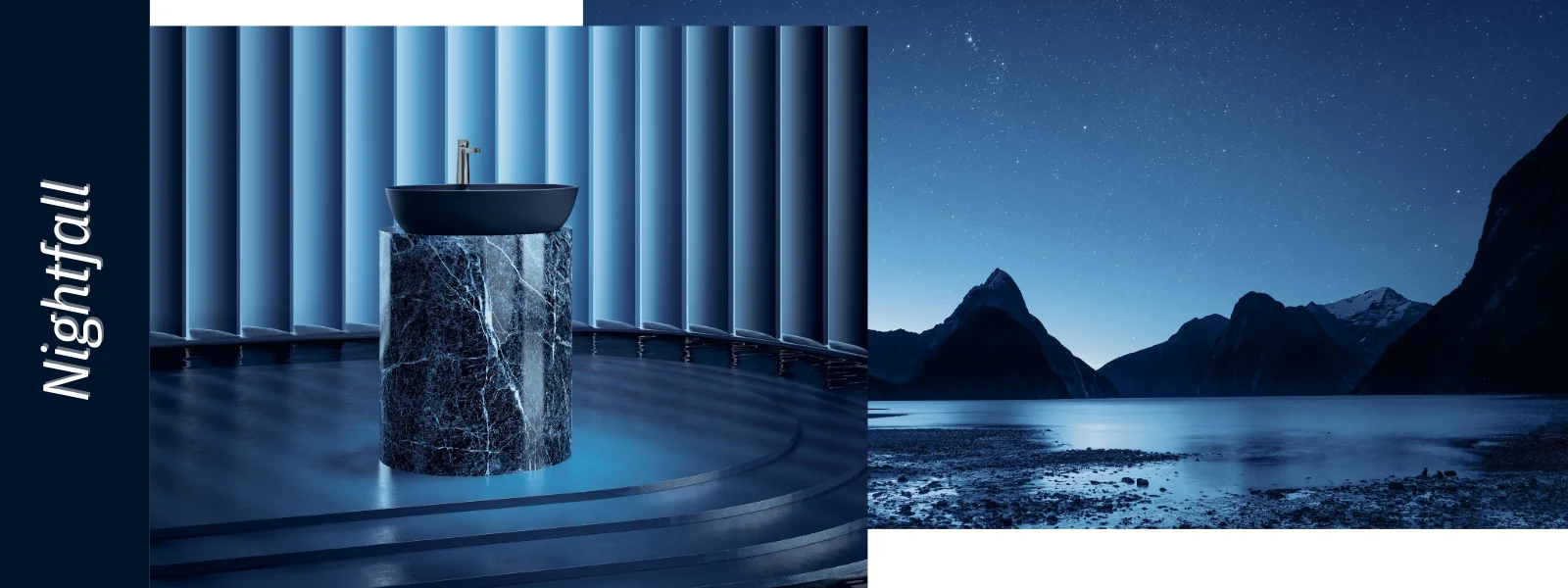 Az alkony nyugalmat áraszt a térben – és magával ragad az éjszakai égbolt végtelen tágasságában. A szín belső csendje különleges erőt kölcsönöz neki: a Nightfall egyszerre intenzív és megnyugtató, miközben varázslatos eleganciával ruházza fel a helyiséget. Luxus hatása tovább hangsúlyozható króm, szálcsiszolt arany vagy matt szálcsiszolt nikkel fémes részletekkel.