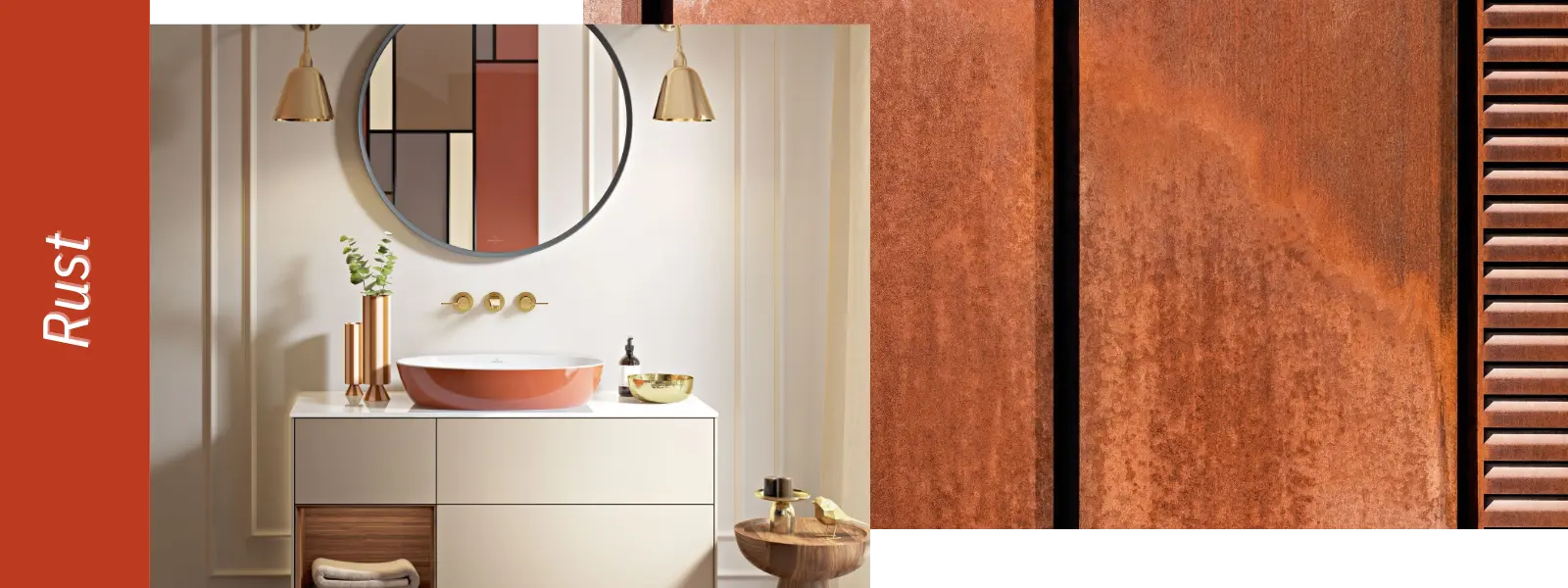 A Rust különleges bájjal rendelkezik: tompított vöröses-narancs árnyalata megnyugtató meleget és természetközeli karaktert sugároz. Földes jellege és harmonizáló hatása révén könnyen belopja magát az emberek szívébe. Meleg fényével gazdagítja a fürdőszobát, sötét színekkel párosítva pedig még inkább kiemelhető egyedi aurája.