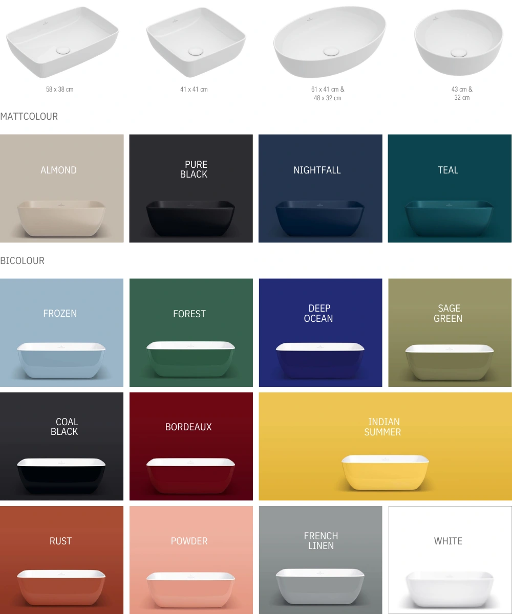 A Gesa Hansen által tervezett színpaletta 10 kéttónusú (BiColour) és 4 teljes felületű színt, valamint két fehér árnyalatot tartalmaz. A Villeroy & Boch életmód- és színszakértőként támogatást nyújt a harmonikus, átgondolt fürdőszobai színvilág megtervezésében.