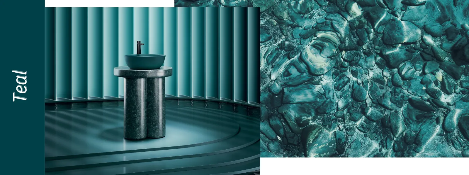 A teal egy titokzatos szín, különleges, megfoghatatlan jelleggel, amely lebeg az elemek – a föld, a víz és a levegő – között. Vágyat ébreszt a távoli vidékek iránt, és a gondolatokat misztikus helyekre repíti. A kék és zöld árnyalatok harmonikus keveréke egzotikus hangulatot kölcsönöz a fürdőszobának, és egyszerre megnyugtató, valamint inspiráló atmoszférát teremt.