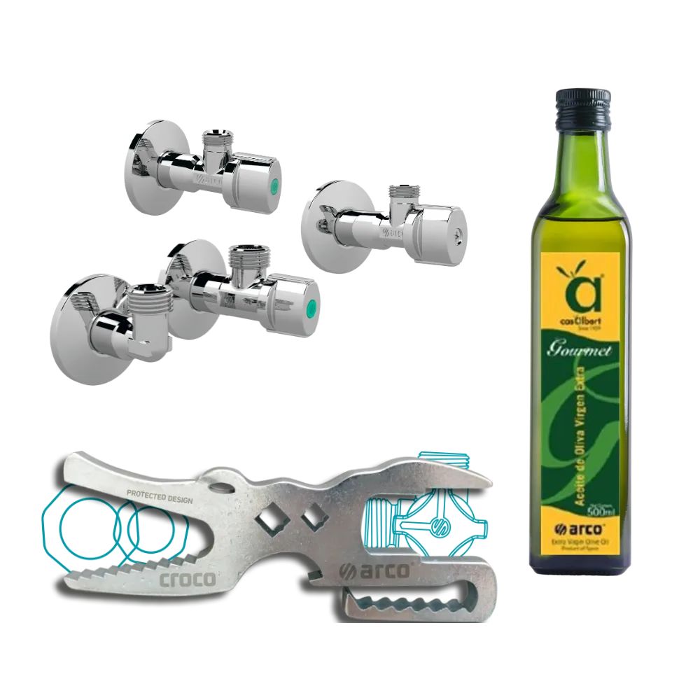 1 db ARCO Croco multifunkcionális szerszám + 3 db ARCO Vitaq vízkőmentes szerelvény + 1 üveg spanyol olívaolaj (0,5l)