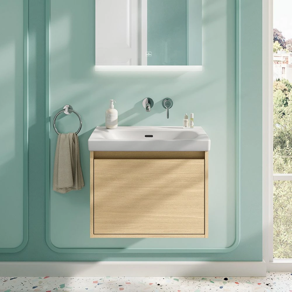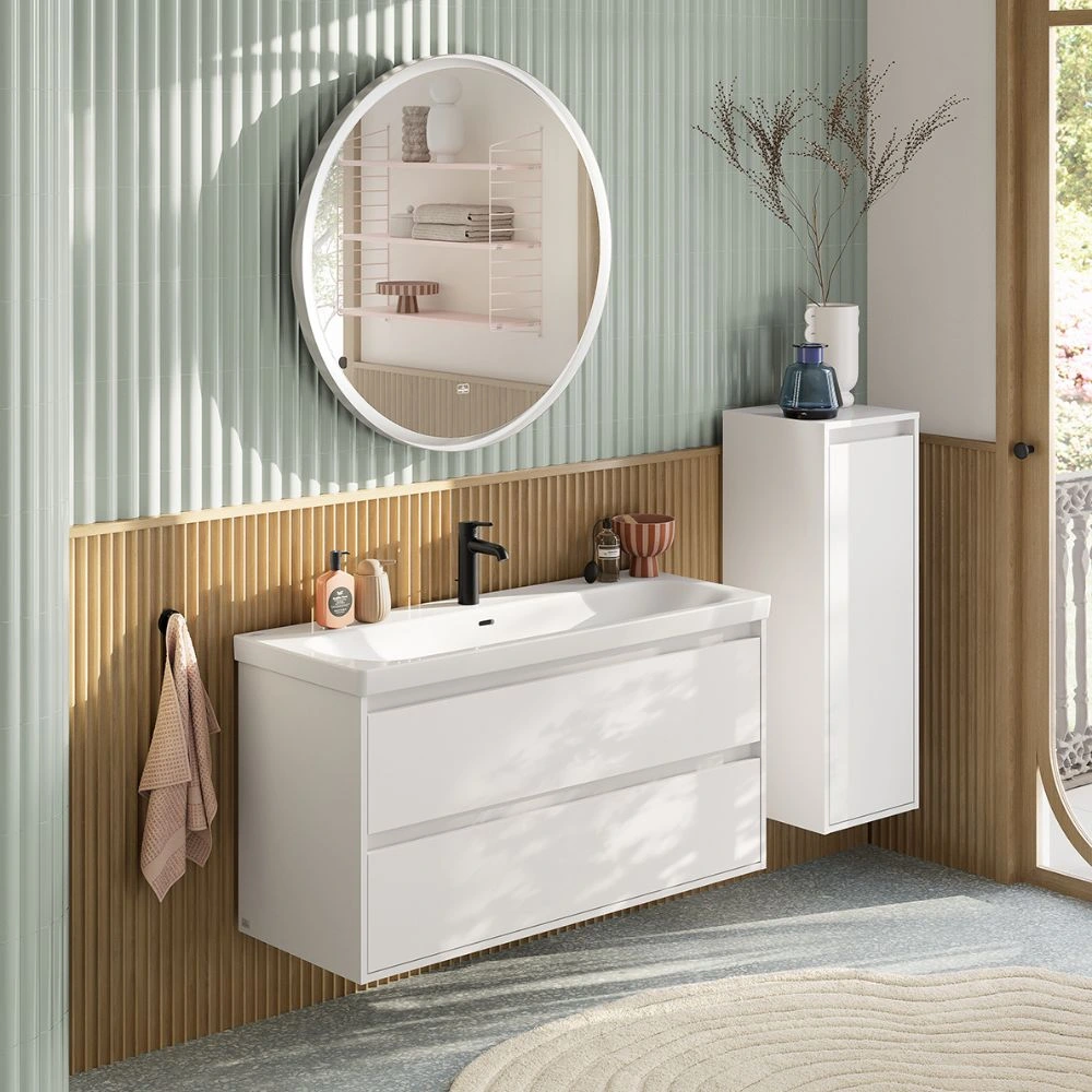 - Zökkenőmentes átmenet a mosdótól a mosdószekrényig